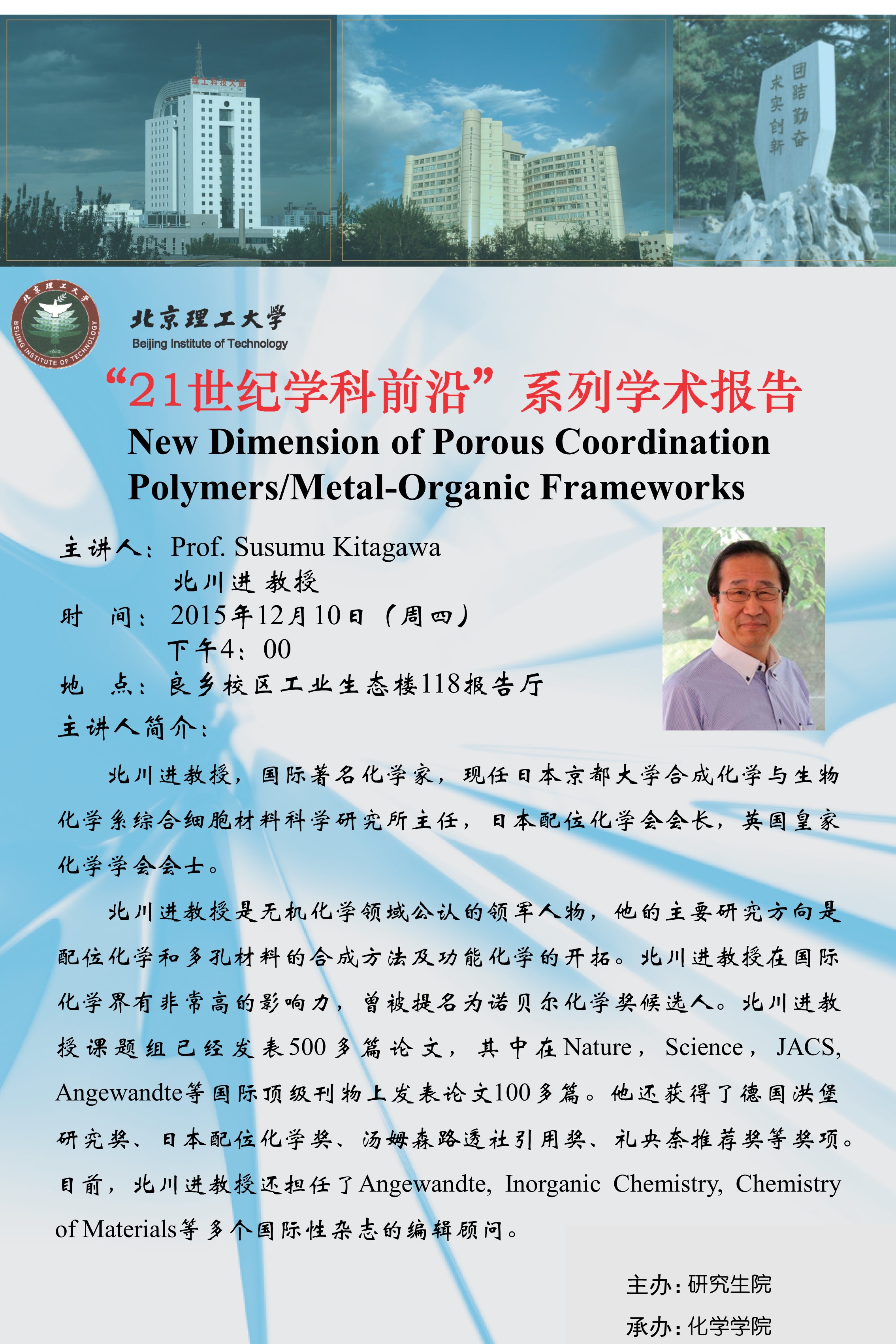 【化學(xué)學(xué)院】“21世紀(jì)學(xué)科前沿”北川進(jìn)教授學(xué)術(shù)報告通知