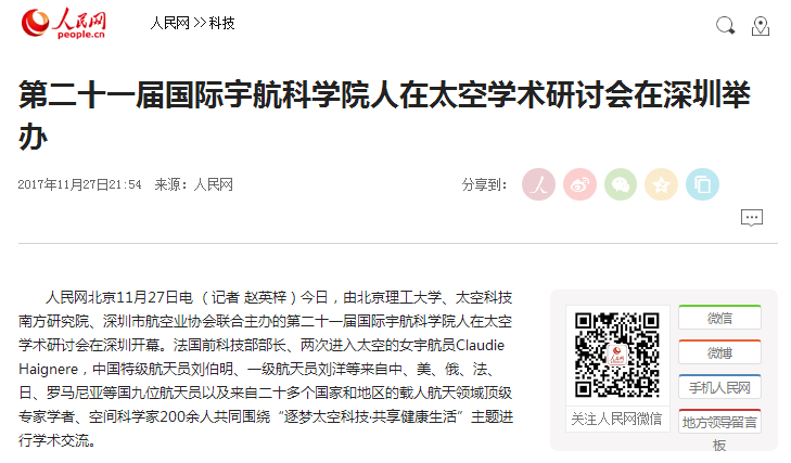 【人民網(wǎng)】第二十一屆國際宇航科學(xué)院人在太空學(xué)術(shù)研討會在深圳舉辦