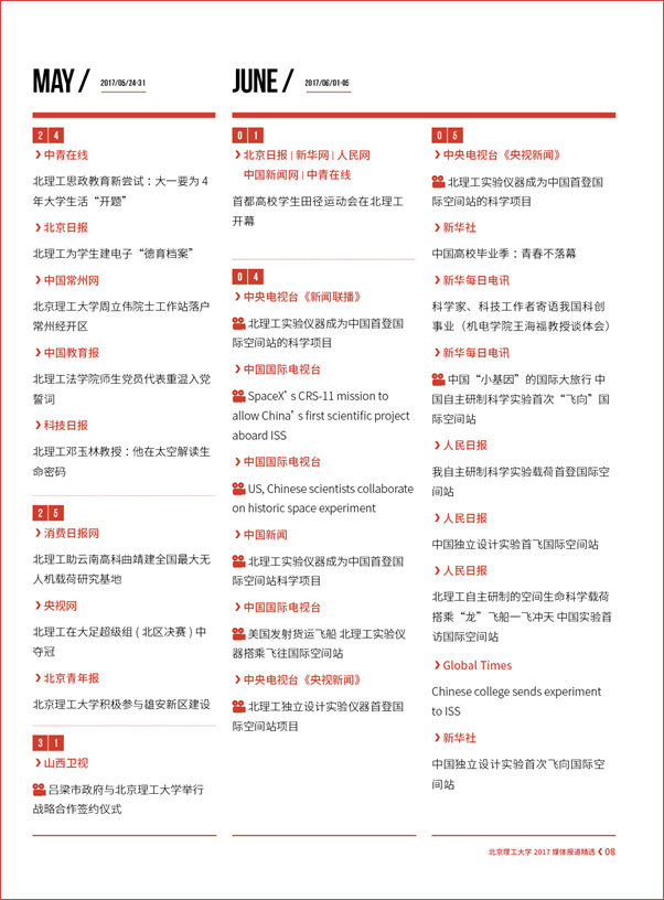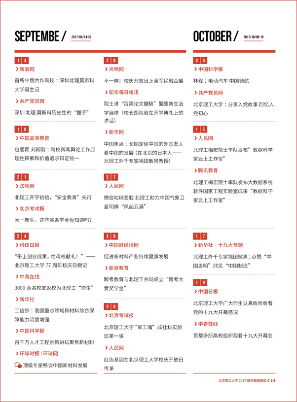 2017年,黨委宣傳部主動策劃學校重大活動外宣48次,共收集媒體首發報道678次,比去年同比增長約77%。新華社、《人民日報》《光明日報》《北京日報》《中國科學報》《科技日報》等媒體,通過平媒、網媒、新媒體以及手機客戶端發布我校報道600余次,中央電視臺、北京電視臺、中國教育電視臺等電視媒體報道50余次,積極打造對外宣傳的“全媒體”格局。