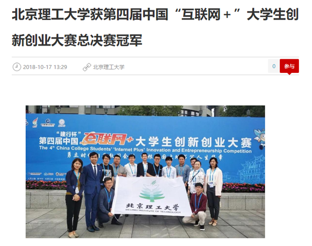 【環球網】北京理工大學獲第四屆中國“互聯網+”大學生創新創業大賽總決賽冠軍