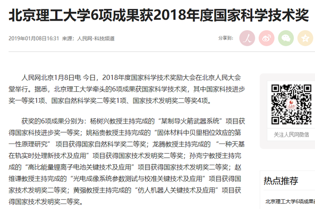 【人民網】北京理工大學6項成果獲2018年度國家科學技術獎
