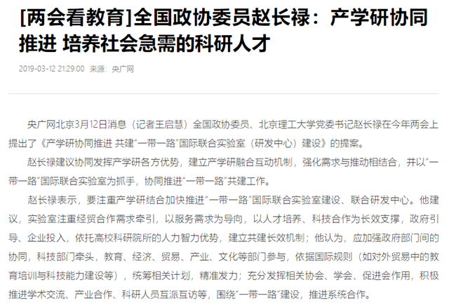 全國政協(xié)委員、北京理工大學黨委書記趙長祿在今年兩會上提出了《產學研協(xié)同推進 共建“一帶一路”國際聯(lián)合實驗室(研發(fā)中心)建設》的提案。