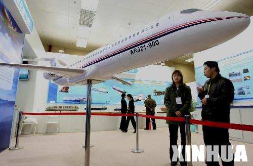 1月11日,參觀者在科技創(chuàng)新重大成就展上觀看由中國航空工業(yè)第一集團研制的ARJ21-900型支線客機,這款飛機將于2008年投放市場。科技創(chuàng)新重大成就展近日在北京舉行,該展以增強自主創(chuàng)新能力為主線,展出了480余項重大科技成果和800余件實物、模型。     新華社記者李明放攝