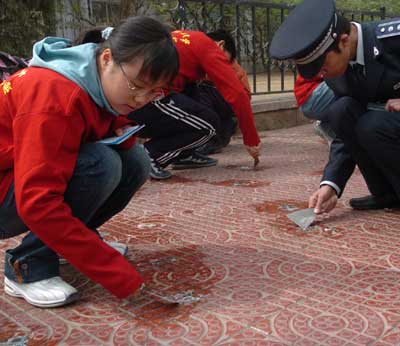 前天下午2點左右,中關村南大街上多了很多手拿小鐵鏟、掃帚、簸箕、塑料袋等工具的義務勞動者,他們都是北京理工大學的學生。兩個小時左右,沿線近兩公里路段的不干膠小廣告被清理。