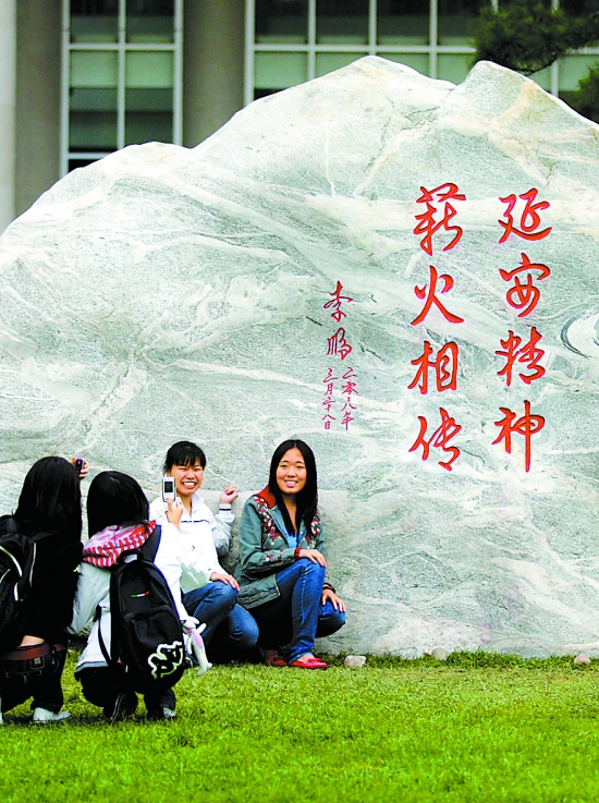 昨天,一尊刻有李鵬同志題詞“延安精神,薪火相傳”的天然景觀石,在北京理工大學(xué)落成。這尊長5.6米、寬1.4米、高3.6米,重達(dá)41.8噸的花崗巖景觀石,產(chǎn)自革命圣地延安。 本報(bào)記者 戴冰攝