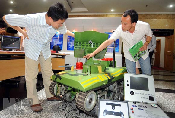 6月22日,北京理工大學機電學院大四學生楊成偉(右)在介紹他獲特等獎的作品——新型多用途反恐防暴機器人。當日,歷時三個多月的第五屆“挑戰杯”首都大學生課外學術科技作品競賽落幕,此次競賽吸引了首都54所高校3000余名同學參加,上報作品547件。據悉,此次競賽結束后,組委會將從獲獎作品中選拔84件作品,參加下半年舉行第十一屆全國“挑戰杯”競賽。新華社記者羅曉光攝