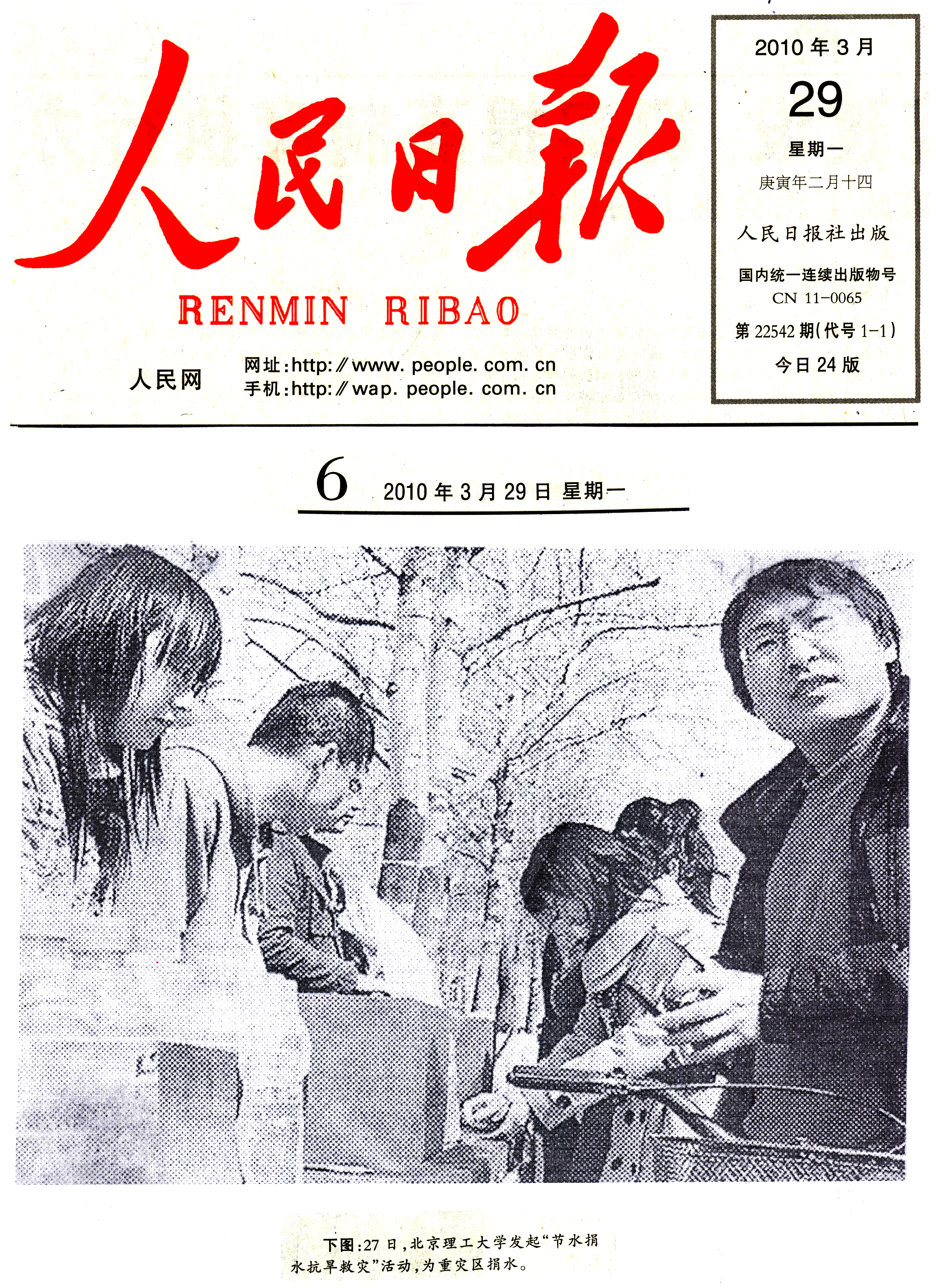 2、《中國青年報(bào)》以“北理工志愿者赴云南災(zāi)區(qū)送水”為題對(duì)送水活動(dòng)進(jìn)行了報(bào)道。