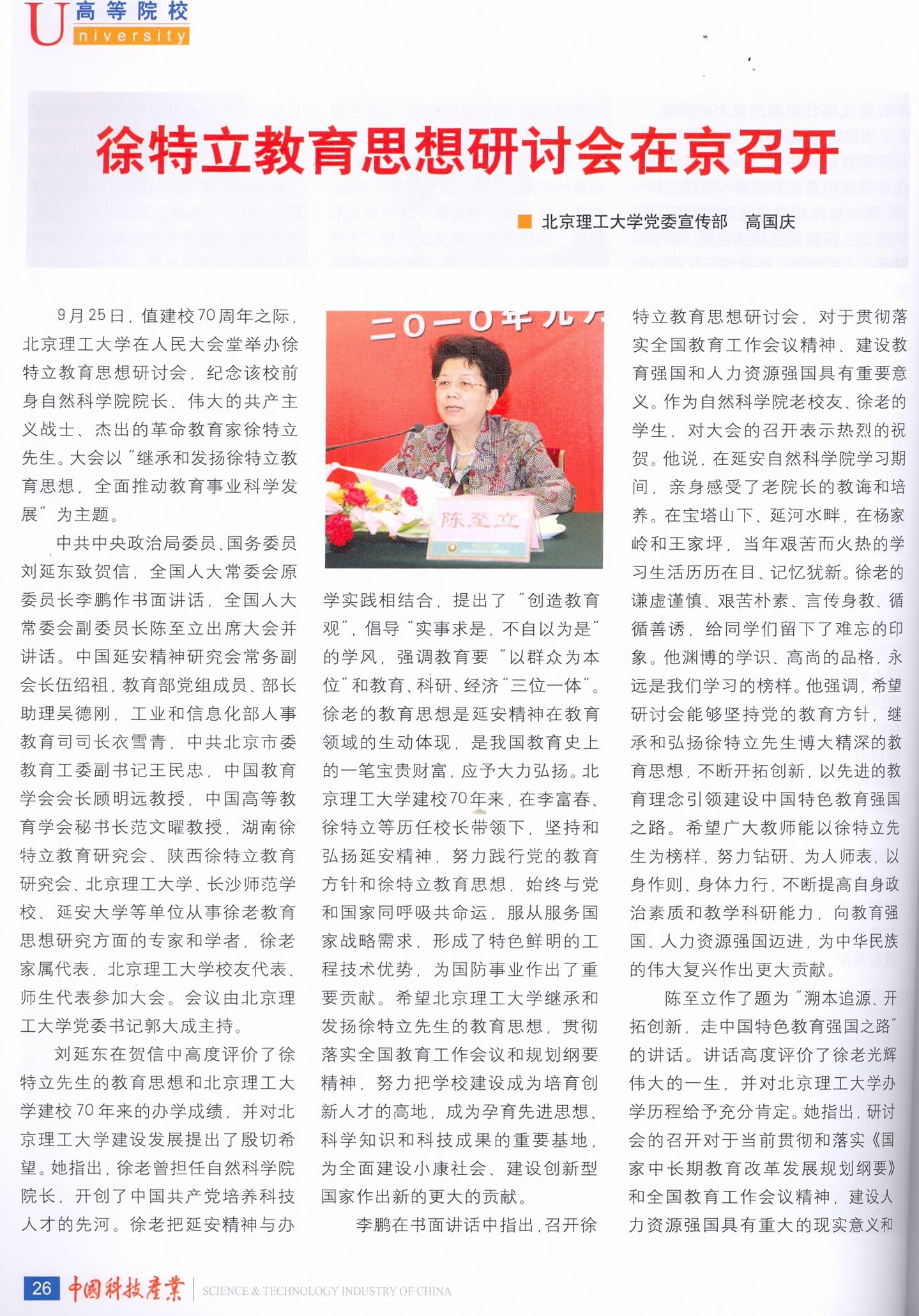 2010年10月10日出版的《中國科技產(chǎn)業(yè)》封面、封底并以12版篇幅報道了我校建校70周年慶?;顒?。報道集中展現(xiàn)了慶祝大會、徐特立教育思想研討會召開的盛況,生動展現(xiàn)了學校的光榮歷史、優(yōu)良傳統(tǒng)、巨大成就和美好前景。