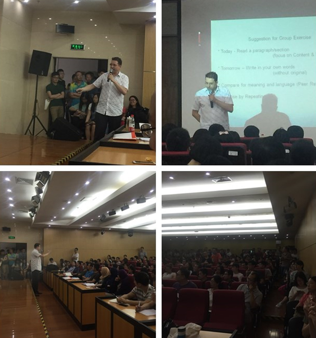 Torsten博士首先介紹了研究者撰寫科學論文的目的和原因,重點強調了科學論文寫作的兩個必要環節:分析和組織科學思想。他形象地闡述了為什么要寫作、如何寫作以及什么是科學寫作等基本內容。接著,Torsten博士分析了國內廣大學者面臨的科學寫作困擾:如何凝練好的科學思想?為什么寫作不能由中文開始?什么是科學語言的規范表達?以及怎樣突破英語水平的局限?Torsten博士的報告引起師生們的強烈共鳴,他詳細解釋了科學寫作的內涵、研究結果與寫作的關系,并舉例說明了科學學術寫作的組織,應是目的、受眾、組織結構、寫作風格、流暢度的有機統一體。當Torsten博士以實際案例告訴師生們,一篇頂級期刊論文的投稿,可以做到不耗費很多時間時,報告現場一片嘩然,大大提升了師生們的信心。