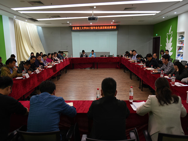2017年4月26日上午,北理工在體育館唯實報告廳召開2017屆畢業生基層就業座談會。黨委組織部、學生工作處、招生就業工作處、繼續教育學院、徐特立學院、圖書館、校友會辦公室負責人,各學院主管學生工作副書記、副院長,以及已簽約地方選調生、村官等項目的畢業生和其他對基層就業感興趣的同學參加了會議。會議由招生就業工作處副處長林驥佳主持。