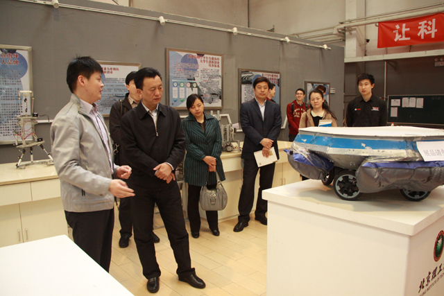 在參加團日活動前,侯寶森參觀了大學生機械創新創業實踐中心,機械與車輛學院團委書記王泰鵬匯報了相關工作開展情況,介紹了學院在教育一體化模式下,基于學院面向全校開展機械相關創新創業實踐活動的機制、做法和成果,并介紹了以科技創新活動為平臺實施“融入式”思想引領的成效。