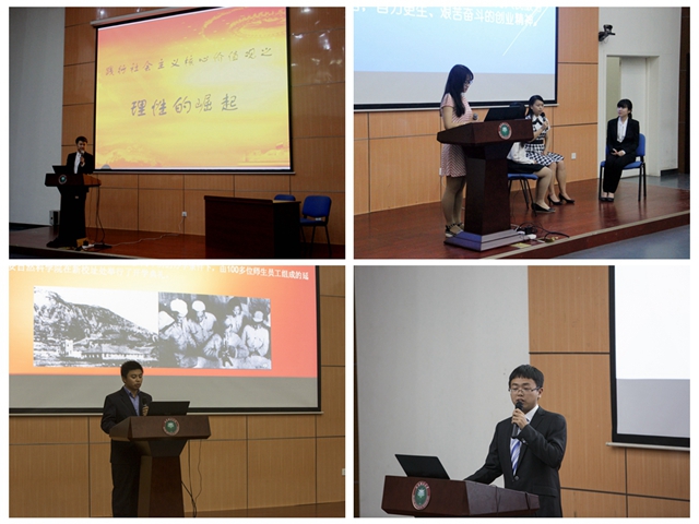 機械與車輛學院機械先鋒隊從也門撤僑事件入手,與印度撤僑進行了對比,結合社會主義核心價值觀的踐行,提出了踐行社會主義核心價值觀要實現理性崛起的命題。人文與社會科學學院青馬講師團采用“鏘鏘三人行”節目訪談的新穎形式,印證了延安精神與社會主義核心價值觀在校園中的傳承和踐行。光電學院的華光社以“尋理工足跡,傳京工文化”為題,以延安為源頭,為同學們深入解讀了北京理工大學的校史和校園文化精神。計算機學院新青年隊以“普世價值的廣泛性與西方制度的局限性”為題,闡釋了普世價值與西方制度的根本區別。