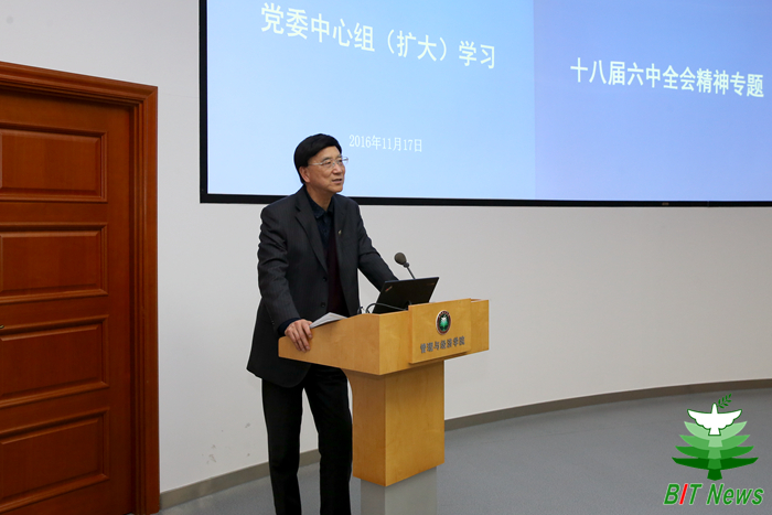 11月17日下午,北京理工大學黨委中心組(擴大)召開專題會議,進一步學習十八屆六中全會精神并作出部署。學校黨委中心組(擴大)成員,各基層黨委、黨總支和直屬黨支部書記,各學院院長,民主黨派負責人,馬克思主義學院教師代表參加了學習。