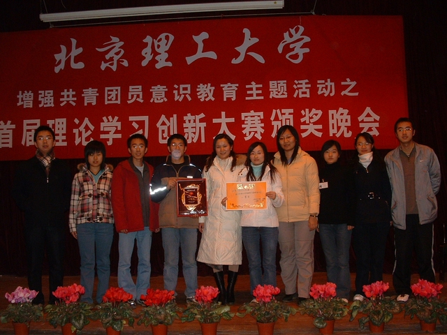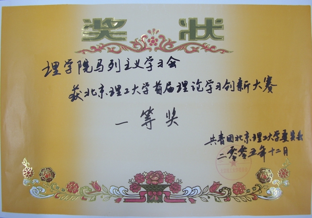 2005年12月12日晚七點,北京理工大學首屆理論學習創新大賽頒獎晚會在七號樓報告廳隆重舉行。理學院馬列主義學習會榮獲本次大賽一等獎。