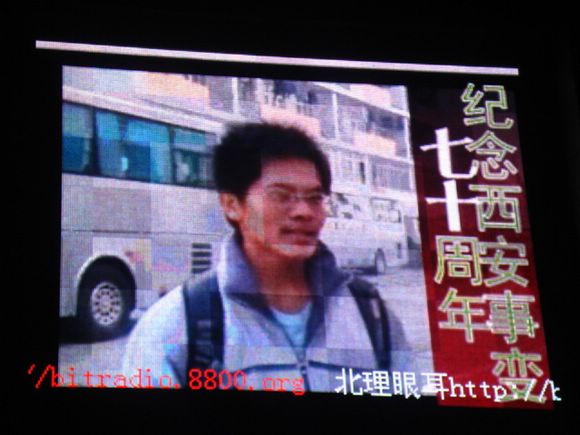 除了通過知識競猜的方式宣傳西安事變,活動工作人員還聯系了校信息樓大屏幕管理人員。12日當日晚上6時許,信息樓大屏幕上播放了有關紀念西安事變七十周年的紀錄片和工作人員在學校內的采訪錄像。大屏幕上播放的內容立刻引起了路過同學的注意,同學們紛紛駐足觀看,并且交流對西安事變認識和理解。