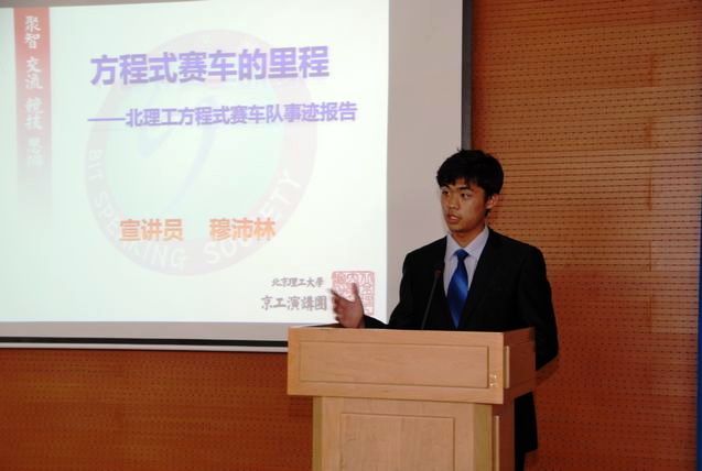 接著,穆沛林宣講員為我們講述了北京理工大學方程式賽車團隊在國家級、國際比賽中取得驕人戰績及輝煌背后的汗水與拼搏。通過列舉該團隊在組建、參賽過程中的實例,為我們詮釋了“自力更生,艱苦奮斗”的真諦。 一群北京理工大學的在校學生,利用課余時間造出了這輛黑鯊,并獲得了第一屆中國大學生方程式比賽的冠軍 300米之內秒殺GTI,0-100km/h加速5.2秒鐘,還有遠遠高于1個G的側向加速度。他們為了夢想敢于挑戰自我,在40多度的車間里,在鋪滿圖紙的工臺上,他們從失敗到成功,贏得了國內外一致的認可,可以說,他們是一群有志向有膽識有毅力的青年,相信他們在以后的日子會做出更大的成績。