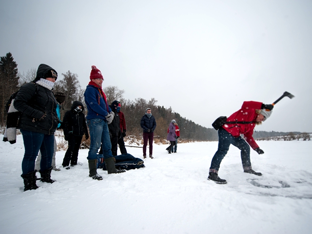 隨后,科考團各小組結合課題實驗設計,分別在多個地點采集水樣、土壤樣本、植物樣本等,并在現場進行了簡單的測試,記錄相關實驗數據。特別是-30℃的嚴寒及風雪天氣下,莫斯科河結冰厚度50余厘米,水樣采集難度非常大,北理工科考隊員與同在生態站科考的美國、俄羅斯、克羅地亞學生一起,共同順利完成了水樣及水體下相關物質的采集。
