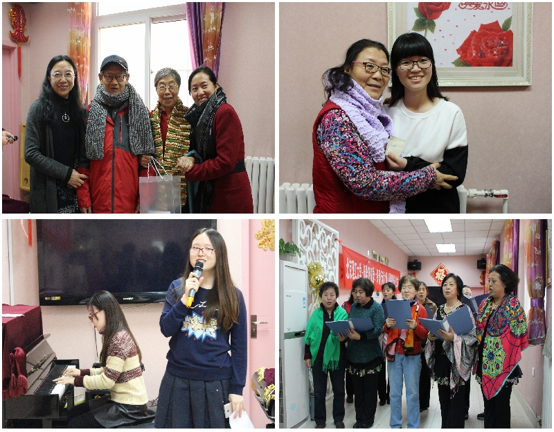 2015年12月29日,在展覽路街道計(jì)生辦科長(zhǎng)高宏彥與新希望家園負(fù)責(zé)人李曉鵬等領(lǐng)導(dǎo)的邀請(qǐng)下,賈曉明老師帶領(lǐng)全體失獨(dú)小組成員連同六位“織青”志愿者代表前往展覽路街道新希望家園參加暖心圍脖贈(zèng)送儀式。在高科長(zhǎng)的主持下儀式正式開(kāi)始,高科長(zhǎng)真誠(chéng)表達(dá)了對(duì)本次活動(dòng)成功舉辦的贊揚(yáng),她表示北理工學(xué)子用行動(dòng)將愛(ài)心傳遞下去的做法感動(dòng)了街道的工作人員,更溫暖了街道的每一位失獨(dú)老人,街道衷心感謝北京理工大學(xué)學(xué)生的積極參與,并將濃濃的情誼化為一張張志愿證書(shū),頒發(fā)給每一位“織青”參與者。真實(shí)記錄的視頻,向在場(chǎng)的每一位老人展示了學(xué)生們從學(xué)習(xí)編織到次次失敗、不言放棄堅(jiān)持織出一條暖心圍脖的過(guò)程,那一雙雙拙扭的手、一個(gè)個(gè)堅(jiān)定的眼神、一張張溫馨的笑臉、、一條條彩色的圍巾構(gòu)成了一幕幕暖心的情誼,感染了在場(chǎng)的每一個(gè)人,許多老人更是留下了激動(dòng)的淚水。贈(zèng)送儀式上,賈老師和諸位“織青”代表給老人們系上了親手編織的圍巾。當(dāng)老人們展開(kāi)圍巾看到每條圍巾上夾的小紙條時(shí),老人們的眼眶再次濕潤(rùn)了,這每一張紙條都是對(duì)應(yīng)圍巾編織者的名字,老人們雖然并沒(méi)有見(jiàn)過(guò)給他們織圍巾的同學(xué),卻反復(fù)朗讀著這個(gè)名字想象著名字背后是怎樣可愛(ài)的學(xué)生,幸福的笑容洋溢在臉上。儀式過(guò)后,老人們載歌載舞表達(dá)他們的喜悅之情,學(xué)生們也紛紛獻(xiàn)上盡心準(zhǔn)備的節(jié)目,一片歡樂(lè)祥和的氣氛回蕩在整個(gè)新希望家園中。