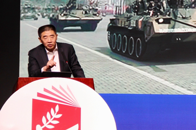 10月26日下午,十一屆全國(guó)政協(xié)委員、中國(guó)戰(zhàn)略文化促進(jìn)會(huì)常務(wù)副會(huì)長(zhǎng)兼秘書長(zhǎng)羅援少將主講“周邊安全環(huán)境及軟實(shí)力建設(shè)”講座。羅援從我國(guó)當(dāng)前的周邊安全環(huán)境引入,分析了臺(tái)灣當(dāng)前的政局形勢(shì)和本質(zhì),講述了我國(guó)對(duì)于實(shí)現(xiàn)祖國(guó)統(tǒng)一的主張和平解放但不放棄武裝解放的原則,介紹了南海軍事演習(xí)的最新情況,強(qiáng)調(diào)了對(duì)青年進(jìn)行愛國(guó)教育的重要性。