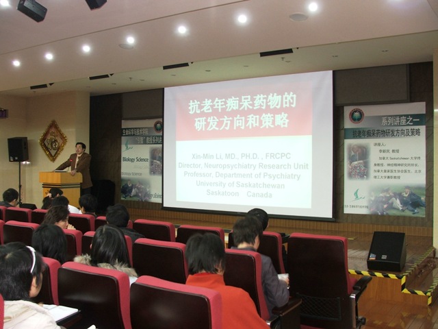 在講座中,李新民教授介紹了目前在抗老年癡呆這個領域上的總體情況及其目前的研究動態。他指出抗老年癡呆是一個對人類健康與發展具有重要的一個方面,在講座中他重點講述了老年癡呆癥的病理、其在各國的發病情況、目前的治療手段以及今后的治療藥物的研發方向和策略。現階段隨著醫療手段的發展和進步,對治療人類的各種病癥都起到了積極的作用,但是老年癡呆癥人們還沒有完成的攻克,李教授分析了這其中的各個環節,并提出了自己獨到的見解和一些戰略問題。